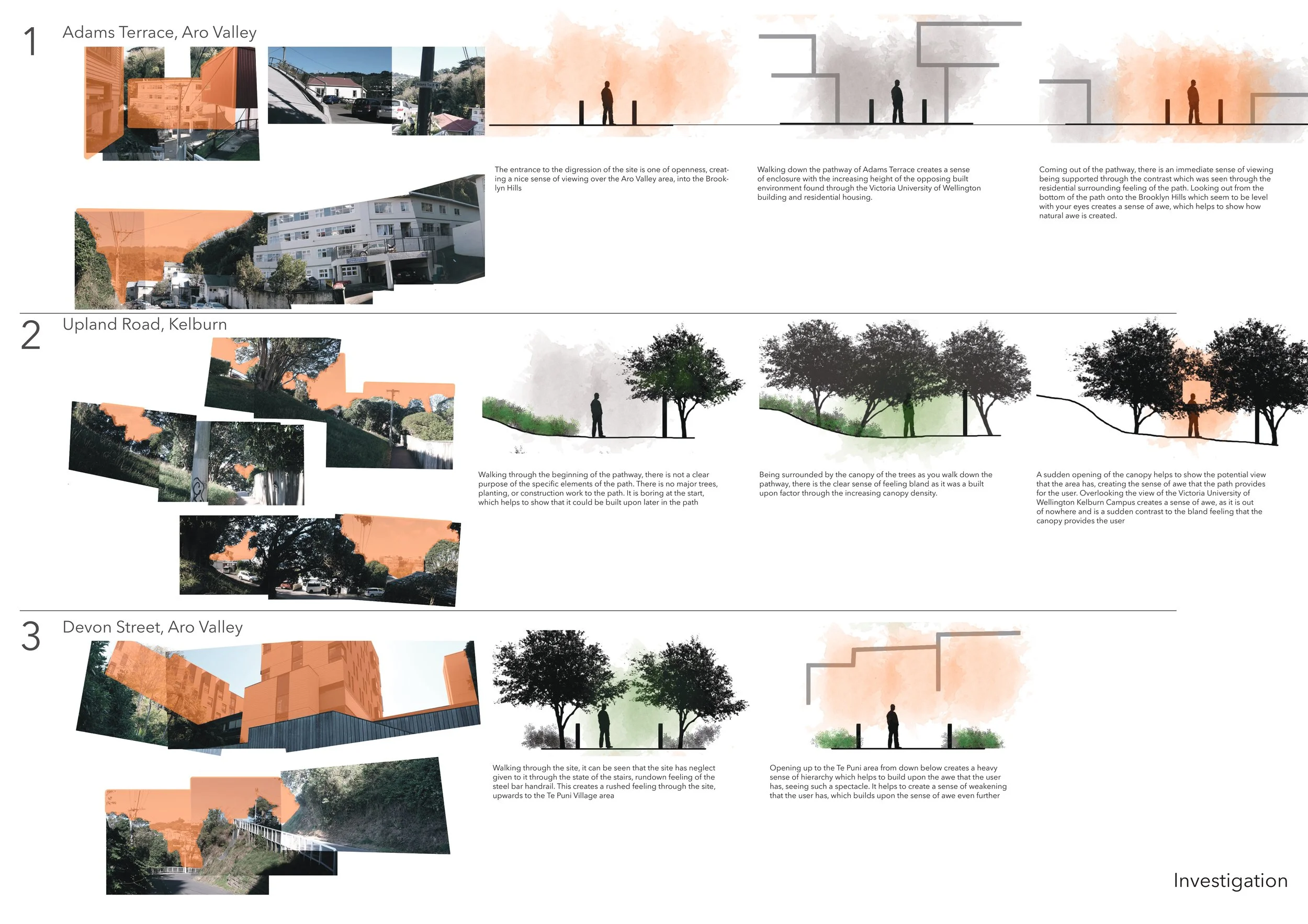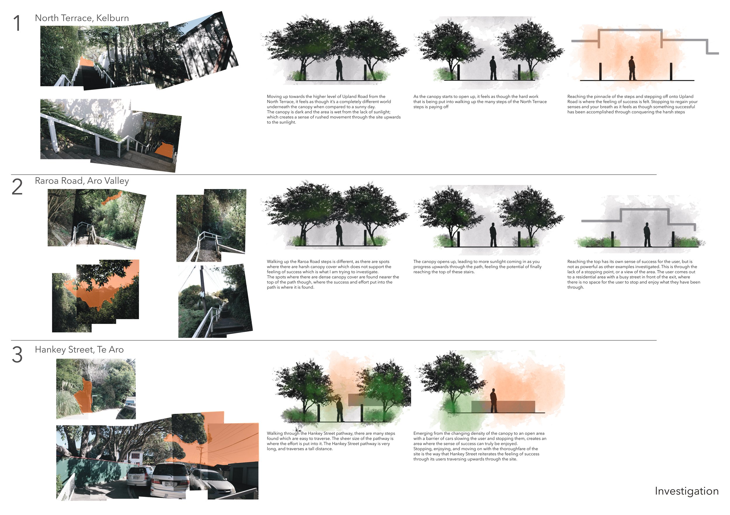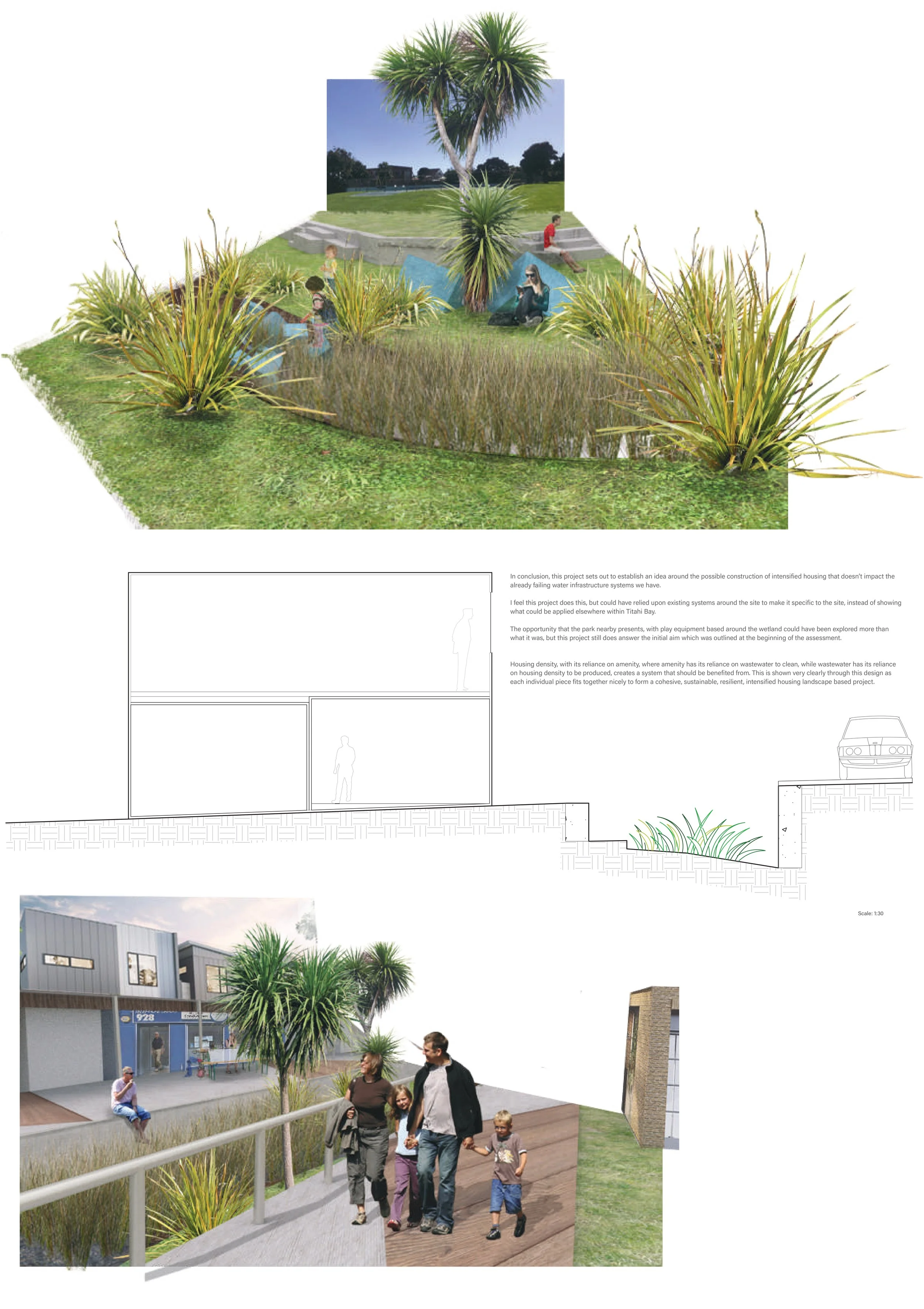 The culmination of my time at university concluded with a thesis exploring the role of landscape architecture in medium-density housing within Wellington, New Zealand. As the work was developed as a complete body of research, individual elements are not shown here to preserve the integrity of the project.